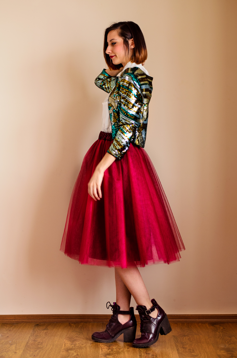 Este look sin lugar a dudas te hará brillar -¡literalmente! Con una chaqueta o un suéter de lentejuelas le pondrás el toque festivo a lo que sea que te pongas. Aquí algunas ideas: